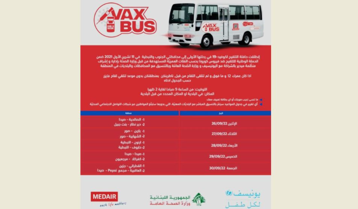 – الجرعة الاولى من عمر 12 سنة وما فوق، والافضلية لمن أتم التسجيل مسبقا على منصة وزارة الصحة العامة لتسريع عملية اعطاء اللقاحات.