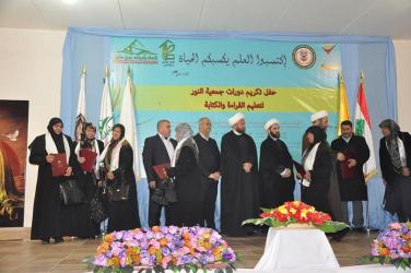 أقامت “جمعية النور” بالتعاون مع اتحادي بلديات جبل عامل وبنت جبيل، لمناسبة ولادة النبي محمد، احتفال التكريم السنوي الثالث للمشاركين في دورات تعليم القراءة والكتابة لعام 2014، برعاية المعاون الثقافي لرئيس المجلس التنفيذي في “حزب الله” الشيخ أكرم بركات، في قاعة حسينية الزهراء في بلدة ميس الجبل، في حضور مدير الجمعية الشيخ حسين شمص، رئيس اتحاد بلديات جبل عامل علي الزين، رئيس اتحاد بلديات قضاء بنت جبيل عطاالله شعيتو، عضو قيادة منطقة الجنوب الأولى في “حزب الله” الشيخ هشام شري بالإضافة إلى عدد من العلماء والفاعليات وحشد من الخريجين.