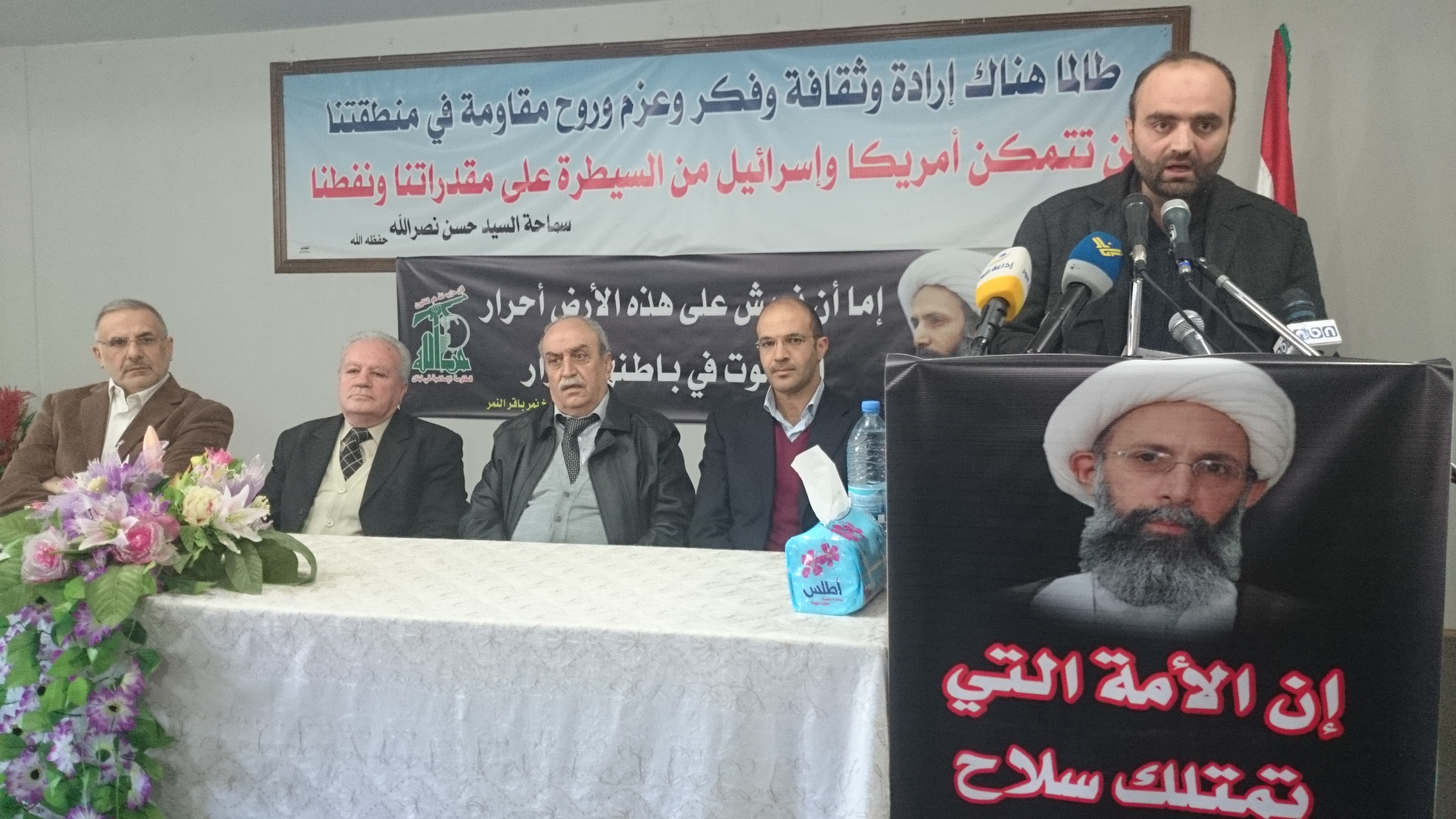 عقد لقاء في مركز باسل الأسد الثقافي الاجتماعي في بعلبك، استنكارا لإعدام الشيخ نمر باقر النمر، بدعوة من “تجمع إعلاميي البقاع”، وبمشاركة النائبين علي المقداد وكامل الرفاعي، رئيس بلدية بعلبك حمد حسن، رئيس قسم إعلام “حزب الله” في البقاع أحمد ريا وفاعليات سياسية واجتماعية وإعلامية.