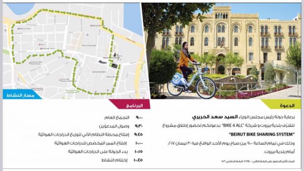 برعاية دولة رئيس مجلس الوزراء سعد الحريري، دعت بلدية بيروت و شركة ” BIKE For ALL ” للمشاركة في إطلاق مشروع بيروت لمحطات الدراجات الهوائية الآلية أو ما يعرف بِ “Bike Sharing System”، وذلك نهار الأحد 30 نيسان 2017 في وسط بيروت، شارع ويغان مقابل مبنى القصر البلدي لمدينة بيروت .