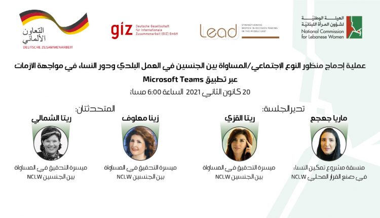 عقدت الهيئة الوطنية لشؤون المرأة اللبنانية، في إطار مشروع “تمكين النساء في صنع القرار المحلي” الذي تنفذه الهيئة بالشراكة مع البرنامج الإقليمي ل GIZ “تمكين النساء في صنع القرار في الشرق الأوسط” LEAD الممول من الحكومة الألمانية، الجلسة الأولى من “عملية إدماج منظور النوع الاجتماعي – المساواة بين الجنسين في العمل البلدي ودور النساء في مواجهة الأزمات”، وذلك ضمن مشروع “التوجيه” الذي يهدف الى تمكين وتثبيت القدرات والمهارات السياسية للنساء المنتخبات في المجالس البلدية بصفتهن مستفيدات من مشروع “التوجيه” وبدعم من “الموجهات” صاحبات الخبرة في العمل السياسي.