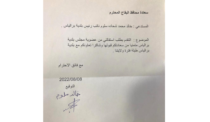 الإستقالات من بلدية برالياس تتوالى ونائب رئيس البلدية يقدم إستقالته إلى محافظ البقاع