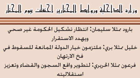 احتفلت وزارة الداخلية وروابط مختاري لبنان، بيوم المختار، برعاية رئيس الجمهورية العماد ميشال سليمان، في قصر الاونيسكو، في حضور وزير الداخلية في حكومة تصريف الاعمال زياد بارود ممثلا رئيس الجمهورية، النائب علي حسن خليل ممثلا رئيس المجلس النيابي الاستاذ نبيه بري، وزير الدولة في حكومة تصريف الاعمال ميشال فرعون ممثلا رئيس حكومة تصريف الاعمال سعد الحريري، السيد عبد الحليم ميقاتي ممثلا الرئيس المكلف نجيب ميقاتي، النائب الان عون ممثلا النائب العماد ميشال عون، العميد وليم مجلي ممثلا النائب السابق لرئيس مجلس الوزراء عصام فارس، الرئيس حسين الحسيني، وزير الدولة في حكومة تصريف الاعمال جان اوغاسبيان، الدكتور زياد الصايغ ممثلا الوزير بطرس حرب، العميد سمير الشعراوي ممثلا الوزير محمد الصفدي، الوزيرة السابقة ليلى الصلح، النواب: محمد قباني، عبد اللطيف الزين، قاسم هاشم، رئيس اتحاد بلديات بشري ايلي مخلوف ممثلا النائبة ستريدا جعجع، علي الشريف ممثلا النائبة بهية الحريري، ايلي يمين ممثلا النائب سليمان فرنجية، لارا سعادة ممثلة النائب سامي الجميل، النائب السابق مخايل الضاهر، المدير العام لوزارة المهجرين احمد حمود، رئيس الصندوق المركزي فادي عرموني، رئيس مرفأ طرابلس السابق انطوان حبيب، رئيس بلدية فرن الشباك ريمون سمعان، رئيس اتحاد بلديات الجومة سجيع عطيه، رئيس بلدية الحازمية جان اسمر، العقيد نديم فارس ممثلا النائب نديم الجميل، وحشد من المخاتير ورؤساء البلديات.