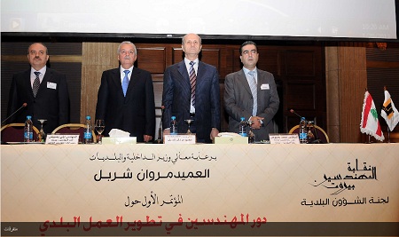 نظمت لجنة الشؤون البلدية في نقابة المهندسين في بيروت المؤتمر الاول، حول دور المهندسين في “تطوير العمل البلدي” في اوتيل حبتور، برعاية وزير الداخلية والبلديات العميد مروان شربل، في حضور وزراء الثقافة غابي ليون، المهجرين ممثلا بالمدير العام احمد محمود، الطاقة ممثلا بكابي جبرايل، الزراعة ممثلا بصلاح الحاج حسن، السفير الاسباني خوان كارلوس غافو النائب حكمت ديب وممثلين عن النواب سامي الجميل، نواف الموسوي وسيرج طورسركيسيان، النائب السابق سليم عون، نقيبي مهندسي بيروت ايلي بصيبص وطرابلس بشير ذوق، مدراء عامين، ممثلي منظمة المدن المتحدة، ممثلي الامم المتحدة ومجلس الانماء والاعمار، رؤساء اتحادات البلديات ورؤساء بلديات ومهندسين.