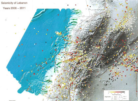 وقال: “ان الدراسات التي اجريت من العام 2006 الى العام 2011، وبعدما اختبرنا قدرتنا على تحديد مواقع الهزات الارضية بدقة، بينت وجود نشاط زلزالي في منطقتين في لبنان. المنطقة التي تمتد على السفح الغربي لجبل عامل والموازية لمجرى نهر الليطاني ومجرى نهر القاسمية ومصب القاسمية والتي عرفت منذ شباط 2008 مسلسلا زلزاليا وصل الى ما يعادل الف هزة في منطقة واحدة بين مثلث شحور – صريفا – قعقعية الجسر وكلها مسجلة في البر وفي المنطقة الموازية، والفالق الذي تمكنا من تحديده في هذه المنطقة صغير لا يزيد طوله على 17 كلم، وعلى رغم كثافة حركته في فترة سنة، لم يسجل عليه الا نحو 7 او 8 هزات شعر بها المواطنون. الهزة الاولى كانت في 12 شباط 2008 وكانت قوتها 4 درجات على مقياس ريختر والهزة الثانية، التي احدثت رعبا في المنطقة وشعر بها المواطنون في كل لبنان كانت في 15 شباط 2008 وبلغت قوتها 5.2 درجات. ثم بدأنا نشعر بهزات راوحت قوتها بين 3.5 و3.3 و3.6 درجات ليدخل بعدها هذا الفالق في فترة سكون ولم يعاود حركته الا منذ نحو اسبوعين اذ سجل في يوم واحد 5 هزات بقوة راوحت بين 3.1 و3.6 درجات.