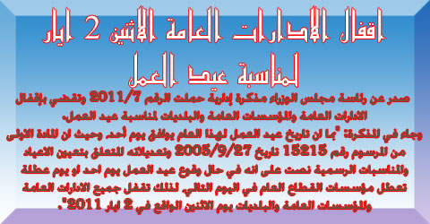 صدر عن رئاسة مجلس الوزراء مذكرة إدارية حملت الرقم 7/2011 وتقضي بإقفال الادارات العامة والمؤسسات العامة والبلديات لمناسبة عيد العمل.