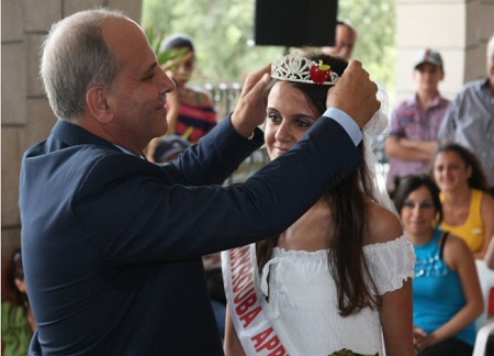 الصورة: رئيس بلدية ميروبا المحامي جورج رشيد سعاده يتوّج تفاحة ميروبا لعام 2012 جوزفين سعاده.