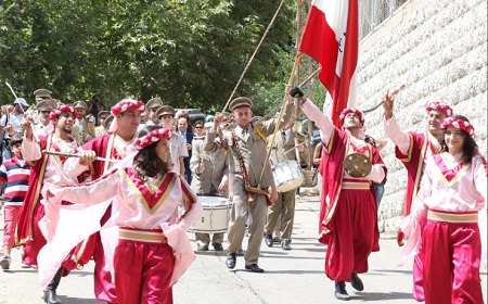 ثم توجه الجميع الى ساحة سيدة ميروبا حيث عزفت لهم الأناشيد الوطنية مع إستعراض للسيف والترس وساروا بإتجاه باحة كنسية مار الياس.