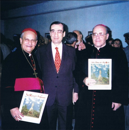 الصورة: المطران جورجيو ماريو برغوليو (البابا فرنسيس) يحمل سيدة ميروبا خلال الإحتفال بتوأمتها مع سيدة لوخان والى جانبه سفير لبنان في الأرجنتين رياض القنطار وراعي ابرشية الأرجنتين المارونية المطران شربل مرعي.