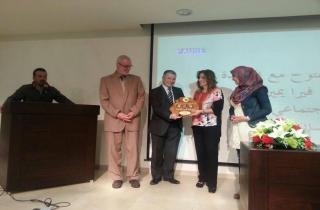 وفي ختام اللقاء قدم رئيس بلدية حارة حريك زياد واكد ونائب رئيس البلدية المهندس احمد حاطوم درعا للسيدة يمين من خشب الزيتون.