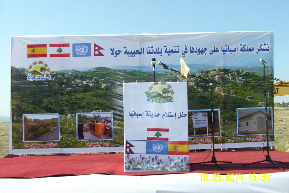 بداية الاحتفال نشيد الامم المتحدة و انانشيد كل من لبنان و النيبال و اسبانيا ومن ثم قرآن كريم بصوت الأخ محمد مزرعاني فكلمة شكر لرئيس بلدية حولا السيد شكيب قطيش و من بعده كلمة قائد فريق مكتب التعاون المدني- العسكري في القطاع الشرقي المقدم أوسكار كاسترو و من ثم تم توقيع وثيقة تسليم الحديقة التي تمت تسميتها ” حديقة اسبانيا ” .